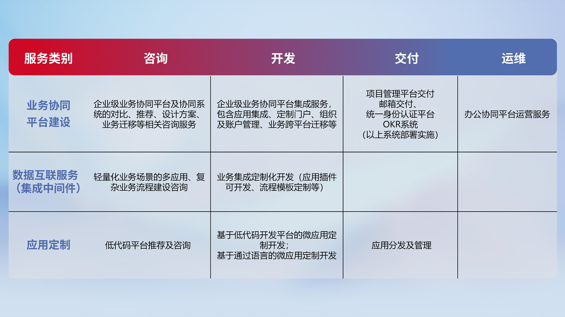 针对钉钉、、、企微、、IDaas等平台级产品提供产品的规划、、、、方案、、、、交付、、、定制化开发等服务,,实现如统一协同办公、、、、智能客户服务、、混合会议管理、、智能数据查询、、等业务场景,,,,实现数字化转型。。。。